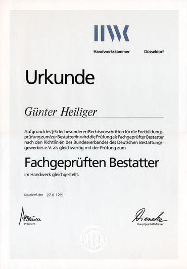 Im Jahr 1984 legt Günter Heiliger die Prüfung zum Dipl. Fachgeprüften Bestatter mit Erfolg ab. Daraufhin wird der Firma das Markenzeichen des Bundesverbandes Deutscher Bestatter verliehen, das nur qualifizierten Betrieben vorbehalten ist.